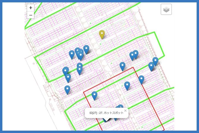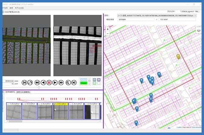 ドローンで撮影した異常箇所がどこのパネルか特定するために、実際に点検する太陽光発電所の図面登録を行います。この作業を行うことで、オルソモザイク画像を作成することなく異常箇所が特定できるので、圧倒的な速さで検査が完了できます。 -
